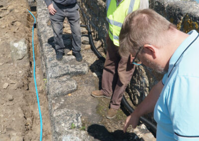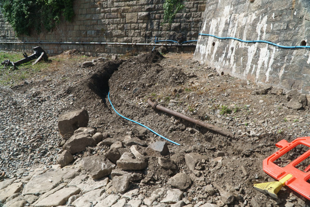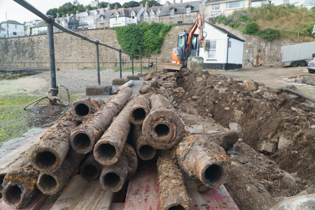 The last few weeks have seen serious progres down the old quay as the heavy machinery arrived to dig a channel for the new water and electricity supply. Once the old cast iron water pipe and heavy-duty electric cable were removed a channel was dug to allow for a new connection T’d off from the harbour’s private water supply and a new connection made to take power from the SWEB junction box at the top of the Narrows access road..