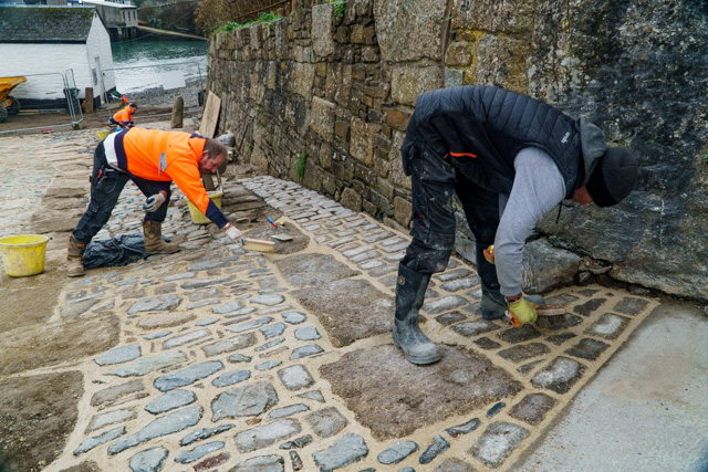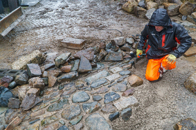 a little bit of rain doesn’t stop Terry from Symons Construction to continue laying in the recycled blue elvan and other granite stone setts…