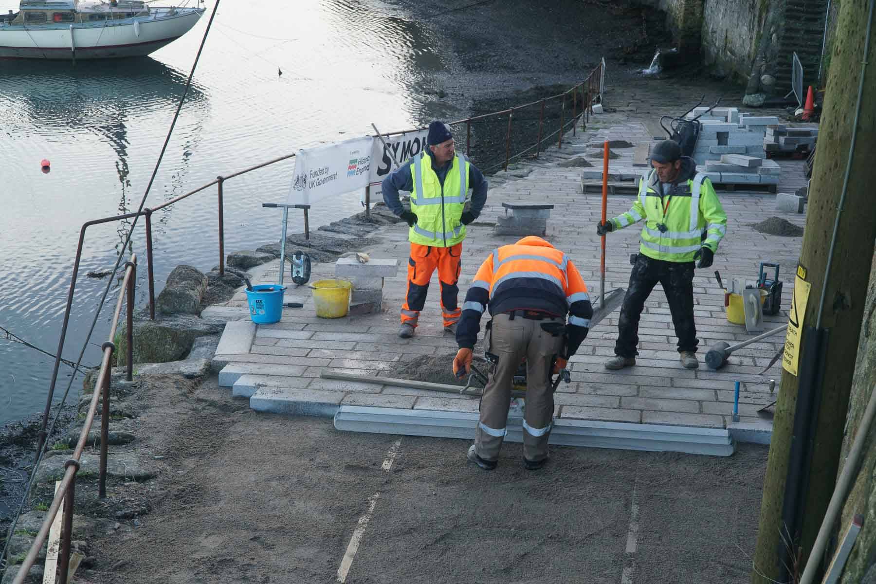 In conjunction with the masonry repairs, significant progress has been made on the Red Lion slip. The project is overseeing the renewal of granite setts across the slipway, replacing modern tarmac and debris with over 350 square meters of Cornish granite. These stones are being meticulously bedded to restore the slip’s 19th-century profile, providing a durable surface suited to both heritage conservation and modern maritime requirements.